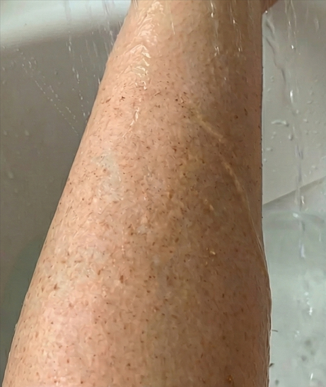 Paso 4 – Usar el guante:Cuando alcances el nivel deseado de exfoliación, enjuagá tu cuerpo con agua y jabón para eliminar las partículas de piel.